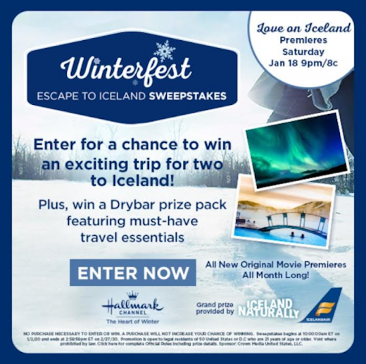 Enter the Hallmark Channel’s “Escape to Iceland” Sweepstakes for a Chance to Win a Trip to Iceland! Tune into “Winterfest” on the Hallmark Channel for new movies all January and don’t miss Love on Iceland on January 18. Music & Art Jan 08, 2020